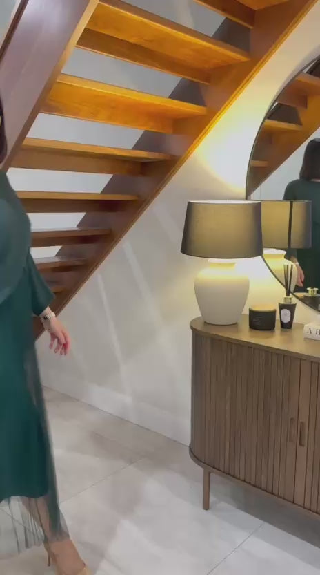 Model wearing tulle dress in forest green