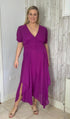 Be bold in our Amber Magenta Dress! The stunning colour pops on any special occasion. Flowing fabric and an asymetric hemline highlight your curves, while the back elasticated waistband and flattering v neckline provide comfort and style. Perfectly lined for a flawless fit. Plus sizes available. (No need to apologize for stealing the show!)
