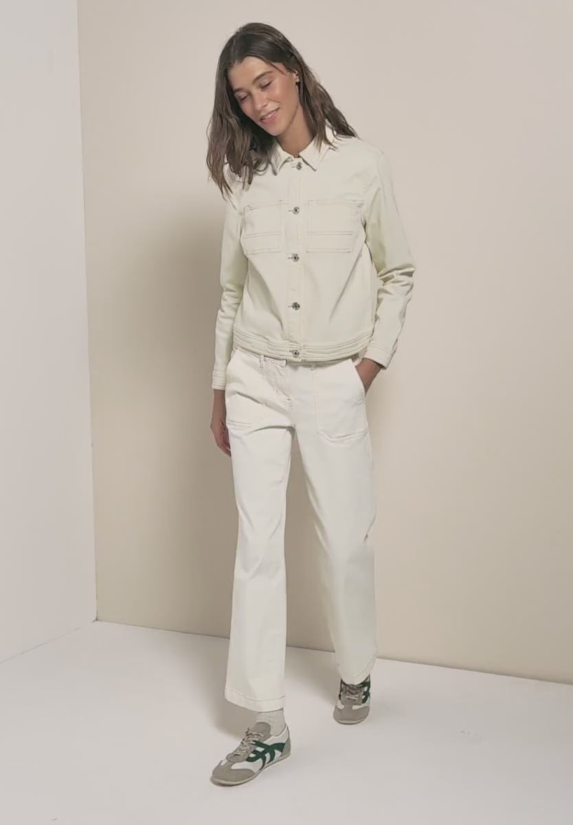 This women's denim jacket from CECIL features a modern ecru wash, bringing a fresh touch to your everyday wardrobe. With its shirt collar, button placket, chest pockets, and buttoned cuffs, it combines classic denim style with sporty casualness. Its cropped cut offers an easy layering option, for example, over a shirt or dress – ideal for your versatile casual look.