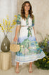 Ready to have heads turning, this timeless design features an exquisite, hand-stylised landscape scene across the skirt, sleeves, and shoulders. Inspired by Claude Monet's exquisite gardens in Giverny, this beauty is complete with delicate, semi-sheer blouson sleeves, a flowing, A-line midi length skirt, a tie waist, and functional buttons.