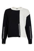This cropped pullover is a modern statement piece crafted in a soft, knitted weave. Designed with a sleek roll neck and a striking black-and-white color block pattern, it offers a bold yet minimalist look. The asymmetrical color split is accented with contrasting stitched detailing along the sleeves and front, adding visual interest to the uni-pattern design. Effortlessly chic, this pullover pairs beautifully with high-waisted pants or skirts for an elevated casual or smart look