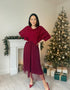 Make a statement in this stunning two-piece ensemble featuring a luxurious knit top paired with a floaty tulle dress in a deep, rich burgundy.